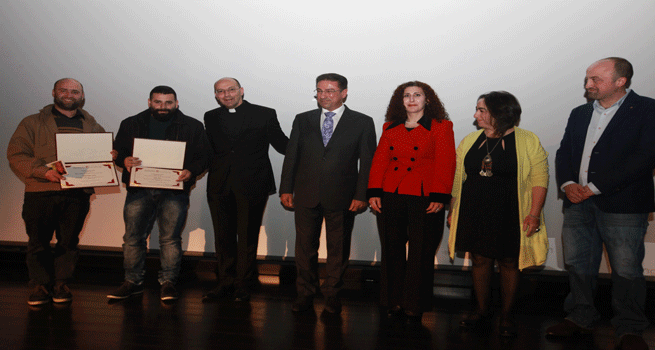 وقام القس الدكتور متري الراهب برفقة  الدكتور يزيد شموط وسط فرحة كبيرة عمت أوساط الحضور بتسليم الجائزة الى الفائزين هما: الفنان بينجي بويادجيان الذي رسم مشهد من الطبيعة الفلسطينية يعبّر عن الواقع الفلسطيني من خلال شجرة الزيتون العريقة الشامخة والصامدة بالرغم من اقتلاعها من الجذور، حيث تتناغم ألوان الطبيعة في لوحة "رقصة في ظهيرة يوم حار" وتنبيء بمستقبل مشرق وسماء زرقاء.