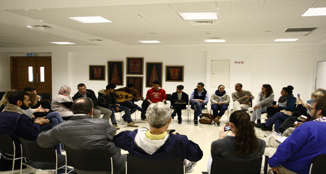 حيث ناقش طلبة الكلية الجامعية والضيوف الأجانب أوضاع الطلبة الفلسطينيين ضمن حوار ثري حمل في ثناياه العديد من القضايا الفنية والثقافية والأوضاع السياسية التي تهم طلبة الكلية الجامعية، كما وتبادل كلا الطرفين وجهات النظر حول الأوضاع الراهنة التي يمر بها الطلبة الفلسطينيين، وتمنى الضيوف الأجانب ان يعم السلام والأمن على أرض فلسطين.
