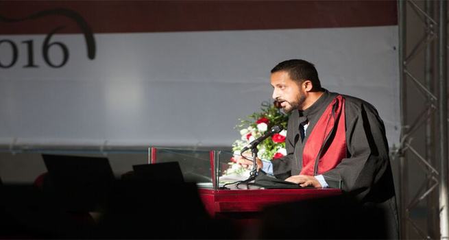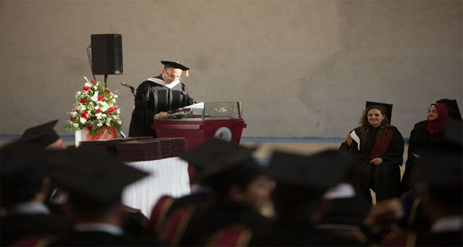 أما كلمة الخريجين فقد ألقاها الخريج رمزي نصري ميخائيل نسطاس من برنامج الفنون التشكيلية المعاصرة تقدم بالشكر والتهنئة لزملائه وزميلاته الخريجين وشكر أساتذة الجامعة على الجهد المتواصل الذي قدموه خلال السنوات السابقة ولما زرعوه فيهم من علم ودأب ورغبة صادقة في البحث والعمل، واهتمام متواصل بالطالب بإعتباره محور العملية التعليمية والتربوية، وفي الختام تحدث: اننا نحتفل اليوم بتخريج الفوج الثامن والذي اختلط فيه نجاحنا بدموع ام عجنت الحياة بماء روحها لترى هذا اليوم وبشموخ اب افنى عمره من أجل هذه اللحظات السعيدة، وتمنى التوفيق والنجاح لجميع الزميلات والزملاء.