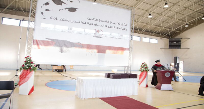 وسط أجواء احتفالية بهيجة، ملؤها الفرح والإنجاز والاعتزاز، احتفلت دار الكلمة الجامعية للفنون والثقافة في مدينة بيت لحم، بتخريج الفوج الثامن من طلبتها من دوائر: الفنون المرئية، والفنون الأدائية، والإرث الثقافي والدراسات السياحية، والتعليم المستمر، وذلك بحضور أعضاء مجلس الأمناء، والهيئتين الإدارية والأكاديمية، وعدد من الشخصيات الهامة، بالإضافة الى حشد من المدعوين وأهالي الطلبة الخريجين.