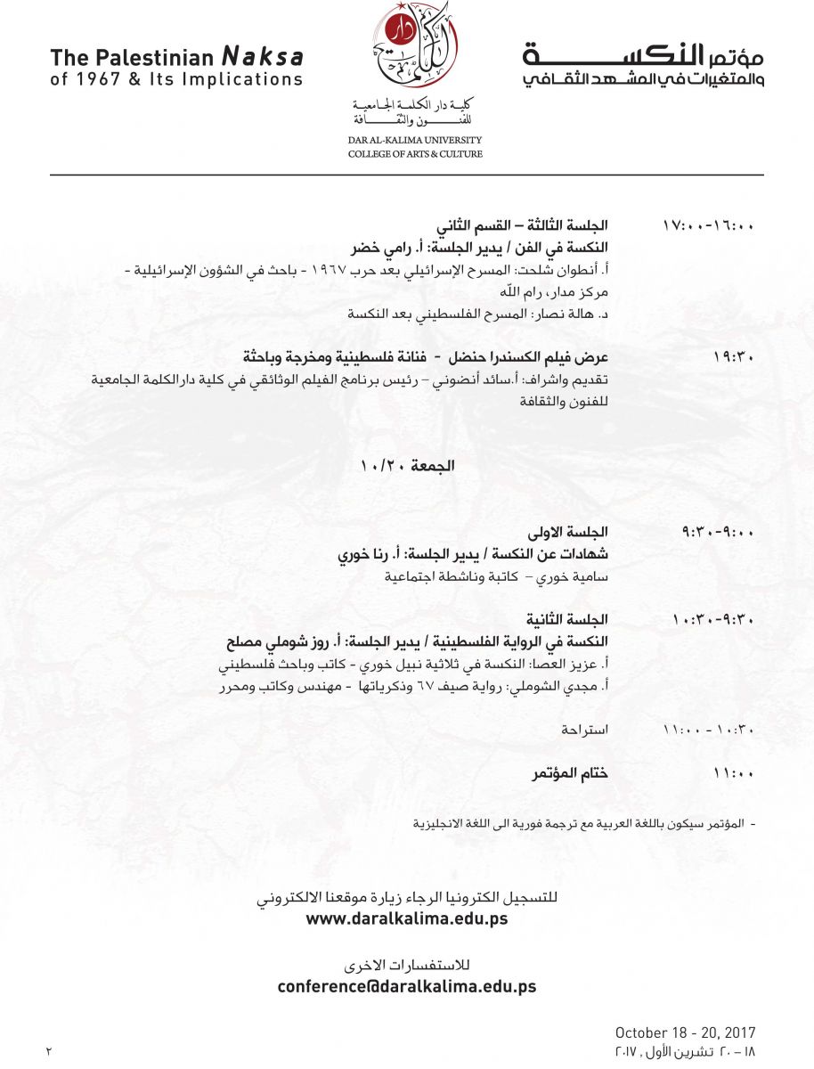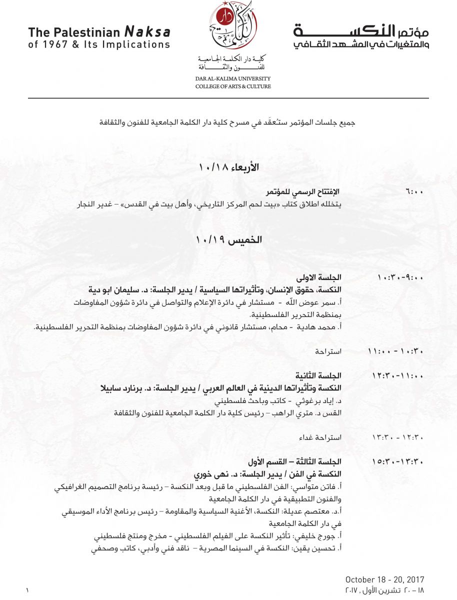 تعقد كلية دار الكلمة الجامعية للفنون و الثقافة بعد مرور الذكرى الخمسين لاحتلال الضفة الغربية بما فيها القدس و قطاع غزة و الجولان عام 1967 مؤتمرها الدولي الخامس عشر بعنوان "النكسة والمتغيرات في المشهد الثقافي " باشتراك نخبة من الاساتذة الجامعين و الخبراء والباحثين. -