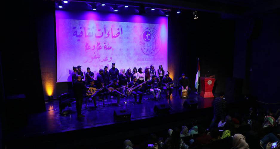 وشملت الفعالية عروض موسيقية قدمها طلبة برنامج الأداء الموسيقية، حيث تنوعت العروض الموسيقية ما بين الأغاني الشعبية والتراثية الفلسطينية والوطنية من الفترات اللاحقة. فمنها اغنية من سجن عكا، يا فلسطينية، يا زهرة النيران، أناديكم، الحق سلاحي، احترف الحزن والانتظار، اصبح الآن عندي بندقية، عاب مجدك وهدي يا بحر هدي.