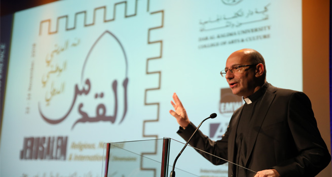 وقد ألقى القس الدكتور متري الراهب مؤسس ورئيس دار الكلمة الجامعية كلمة أكد خلالها: " ياتي هذا المؤتمر اليوم كخطوة على تسليط الضوء على مدينة القدس وما تتعرض له من انتهاكات هادفة وحملة استعمارية استيطانية شرسة وممنهجة، ومعركتنا في القدس معركة وجود، اما ان نكون او لا نكون، وبدون القدس لا دولة، ولا وحدة جغرافية، ولا مقدسات دينية، اجل القدس بعد وجداني، ويخطيء من يظن أن معركتنا في القدس قي فقط معركة سياسية، أو ديمغرافية فحسب، بل هي ايضاً معركة أكاديمية لم تحتل اسرائيل القدس فحسب، بل هي احتلت بمفكريها المنصات الاكاديمية وراحت تروج عن طريق الكتب والمنشورات والابحاث تارة لمدينة داوود، وتارة اخرى للهيكل المنشود، وثالثة لعلية صهيون".