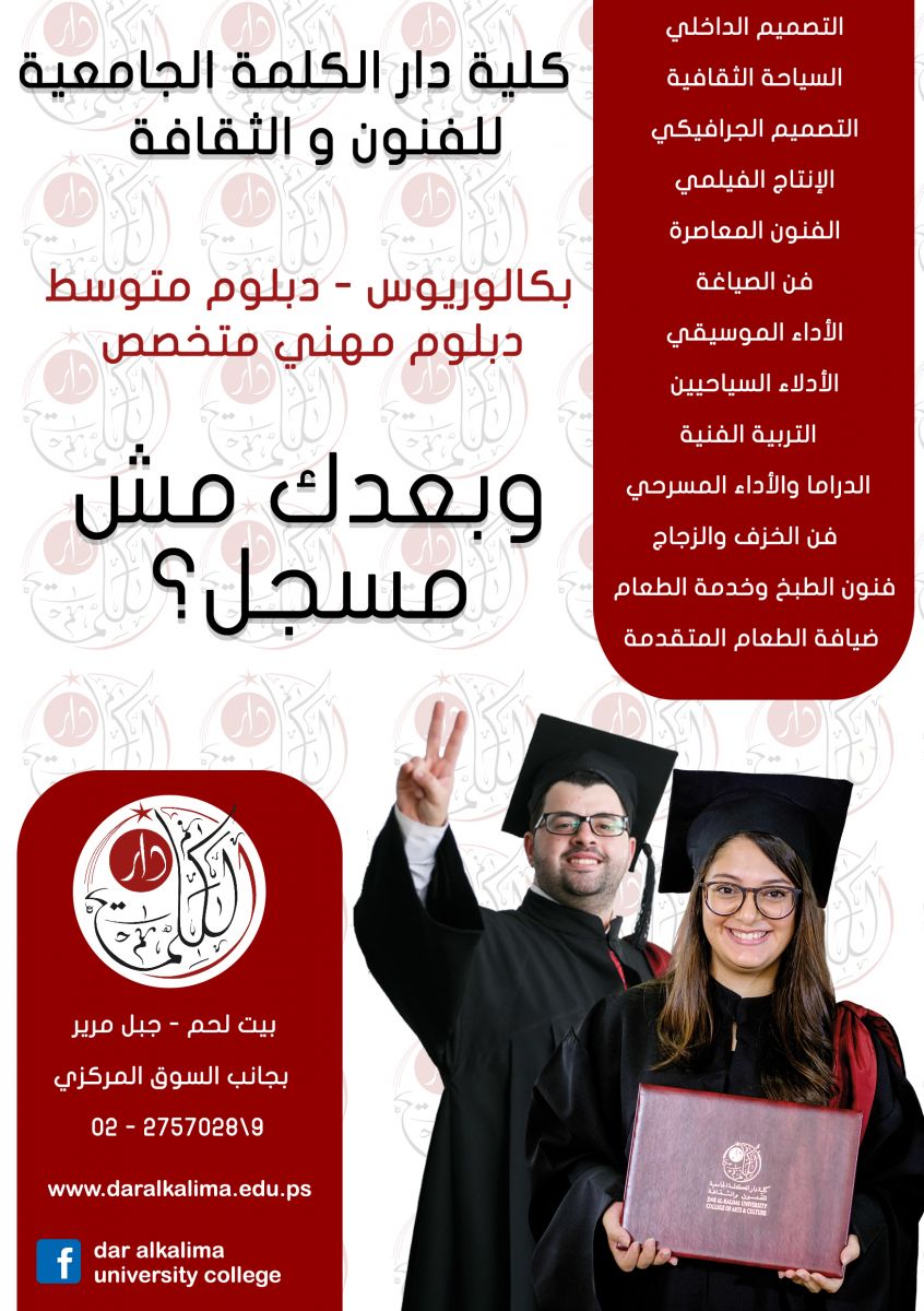 تعلن كلية دار الكلمة الجامعية للفنون والثقافة في بيت لحم عن فتح باب القبول والتسجيل للعام الدراسي 2019/2020 في التخصصات التالية: