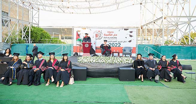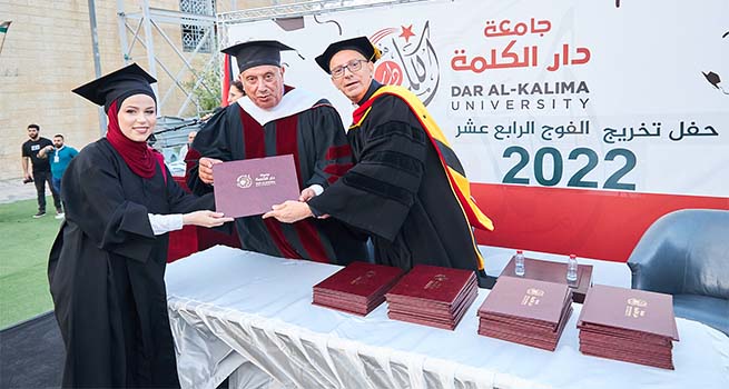 احتفلت جامعة دار الكلمة في مدينة بيت لحم، بتخريج الفوج الرابع عشر من طلبتها، وذلك تحت رعاية معالي أ. د. محمود أبو مويس وزير التعليم العالي والبحث العلمي، وبحضور كل من القس أ. د. متري الراهب مؤسس ورئيس جامعة دار الكلمة، ومجلس الأمناء ونواب الرئيس والهيئتان الإدارية والأكاديمية، وعدد من رؤساء وممثلي الجامعات الفلسطينية و الى جانب لفيف من ممثلي المؤسسات الرسمية والمجتمعية والإعلامية المختلفةوالشخصيات العامة، والخريجين وأهاليهم.
