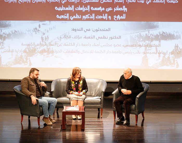 وافتتح الندوة الثقافية القس البروفيسور متري الراهب مؤسس ورئيس جامعة دار الكلمة بكلمة قال خلالها: " ما يميز هذه الندوة الثقافية أنها المرة الاولى الذي يكون هنالك فيها تعاون بين جامعة دار الكلمة ومؤسسة الدراسات الفلسطينية وأمنياتي ان تكون هذه باكورة لتعاون اعمق واشمل في المستقبل، وقد هنأ القس البروفيسور متري الراهب المؤرخ والباحث الدكتور نظمي الجُعبة على هذا الكتاب والذي هو الكتاب الاول من نوعه باللغة العربية كما وهنأ مؤسسة الدراسات الفلسطينية على إصدار الكتاب".