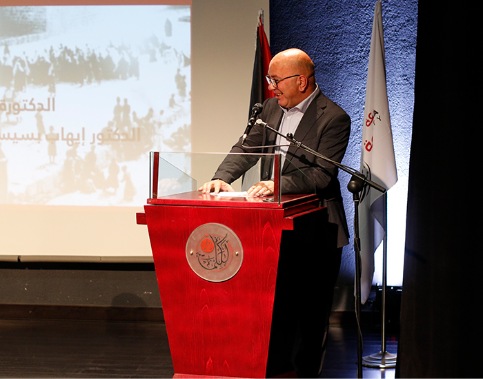 والقى الأستاذ خالد فراج المدير العام لمؤسسة الدراسات الفلسطينية كلمة ذكر فيها: " هذه ليست المرة الأولى التي يؤلف فيها الدكتور نظمي الجُعبة كتاب فهو من كبار الباحثين في مؤسسة الدراسات الفلسطينية حيث تحتفل المؤسسة هذا العام بمرور 60 عام على تأسيسها، وهذا بالنادر أن يحصل في الوطن العربي، حيث أسست في لبنان - بيروت التي مرت بحروب وحروب واخرها الانهيار الاجتماعي والاقتصادي لدولة كلها ولكن مؤسسة الدراسات الفلسطينية صامدة بفلسطين وبكل فروعها في العالم والسبب يعود الى صرامة بحثها وانتاجها العلمي ورفضها لأي تمويل مشروط".