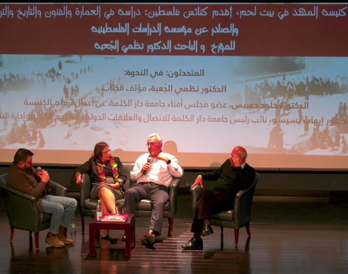 أطلقت جامعة دار الكلمة ومؤسسة الدراسات الفلسطينية كتاب كنيسة المهد في بيت لحم، أقدم كنائس فلسطين: دراسة في العمارة والفنون والتاريخ والتراث والصادر عن مؤسسة الدراسات الفلسطينية للمؤرخ والباحث الدكتور نظمي الجُعبة، وذلك خلال ندوة ثقافية اقيمت في مسرح جامعة دار الكلمة في مدينة بيت لحم.