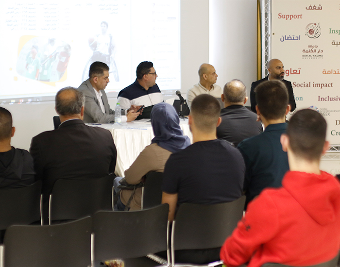 نظمت جامعة دار الكلمة في مدينة بيت لحم، وضمن الخطة الأكاديمية لبرنامج بكالوريوس الإدارة الرياضية، وضمن مساق "الرياضة من أجل الدمج الإجتماعي" ندوة بعنوان دور الرياضة في الدمج الإجتماعي لذوي الاعاقة، وقد حضر الندوة عدد من الهيئتين الإدارية والأكاديمية في الجامعة بالاضافة الى العديد من المهتمين والمختصين من المؤسسات المختلفة، وذلك على مسرح جامعة دار الكلمة.