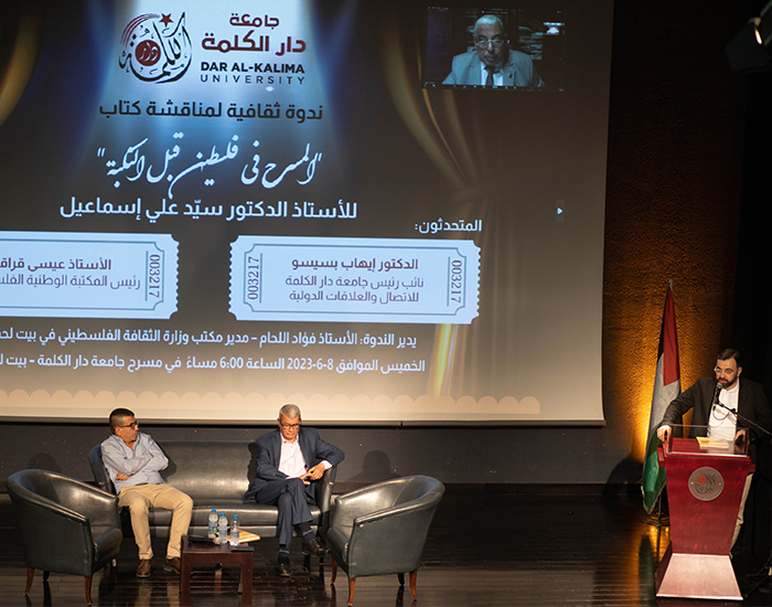 نظمت كل من جامعة دار الكلمة والمكتبة الوطنية الفلسطينية ووزارة الثقافة الفلسطينية، ندوة ثقافية لمناقشة كتاب "المسرح في فلسطين قبل النكبة" للأستاذ الدكتور سيّد علي إسماعيل، وقد حضر الندوة عدد من الشخصيات الاعتبارية البارزة والمثقفين والمهتمين والمختصين من المؤسسات المختلفة.