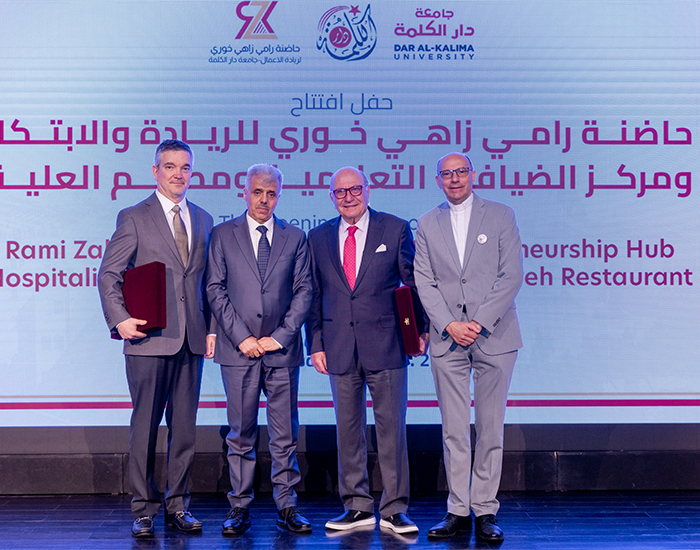 احتفلت جامعة دار الكلمة في مدينة بيت لحم تحت رعاية دولة الدكتور محمد مصطفى رئيس وزراء دولة فلسطين، بافتتاح حاضنة رامي زاهي خوري للريادة والابتكار ومركز الضيافة التعليمي ومطعم العلية، بحضور عدد من الشخصيات الاعتبارية والدبلوماسية الدولية والفلسطينية وممثلي السفارات والقنصليات الدبلوماسية العاملة في فلسطين ورجال الأعمال ورجال الدين والمهتمين.