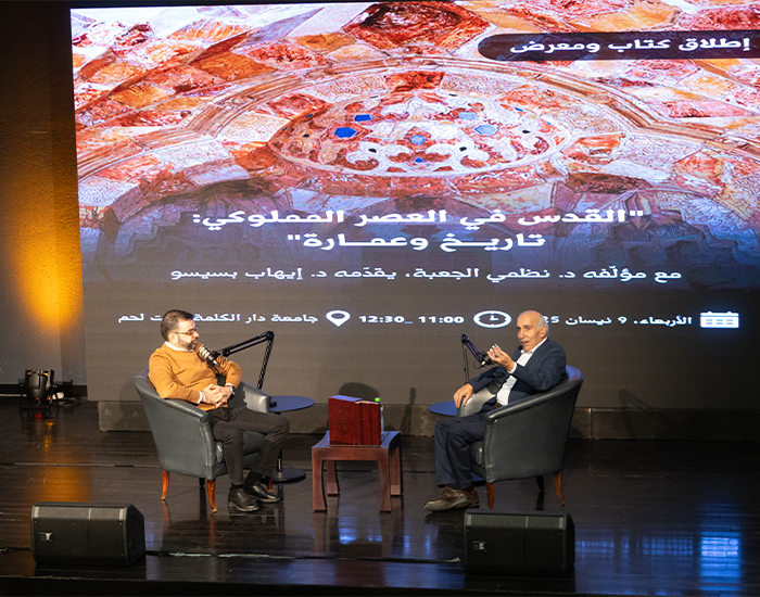 أطلقت كل من جامعة دار الكلمة، ومؤسسة التعاون، والمتحف الفلسطيني كتاب "القدس في العصر المملوكي: تاريخ وعمارة"، لمؤلّفه الدكتور نظمي الجعبة، خلال ندوة ثقافية أقيمت في مسرح جامعة دار الكلمة في مدينة بيت لحم، وقد رافق الإطلاق معرض للقيّم إياد عيسى بعنوان "القدس المملوكيّة"، مستوحى من فصول الكتاب، يستعرض أكثر معالم القدس أهمية في ذلك العصر، عبر مجموعة من الصور والخرائط والمخطّطات.