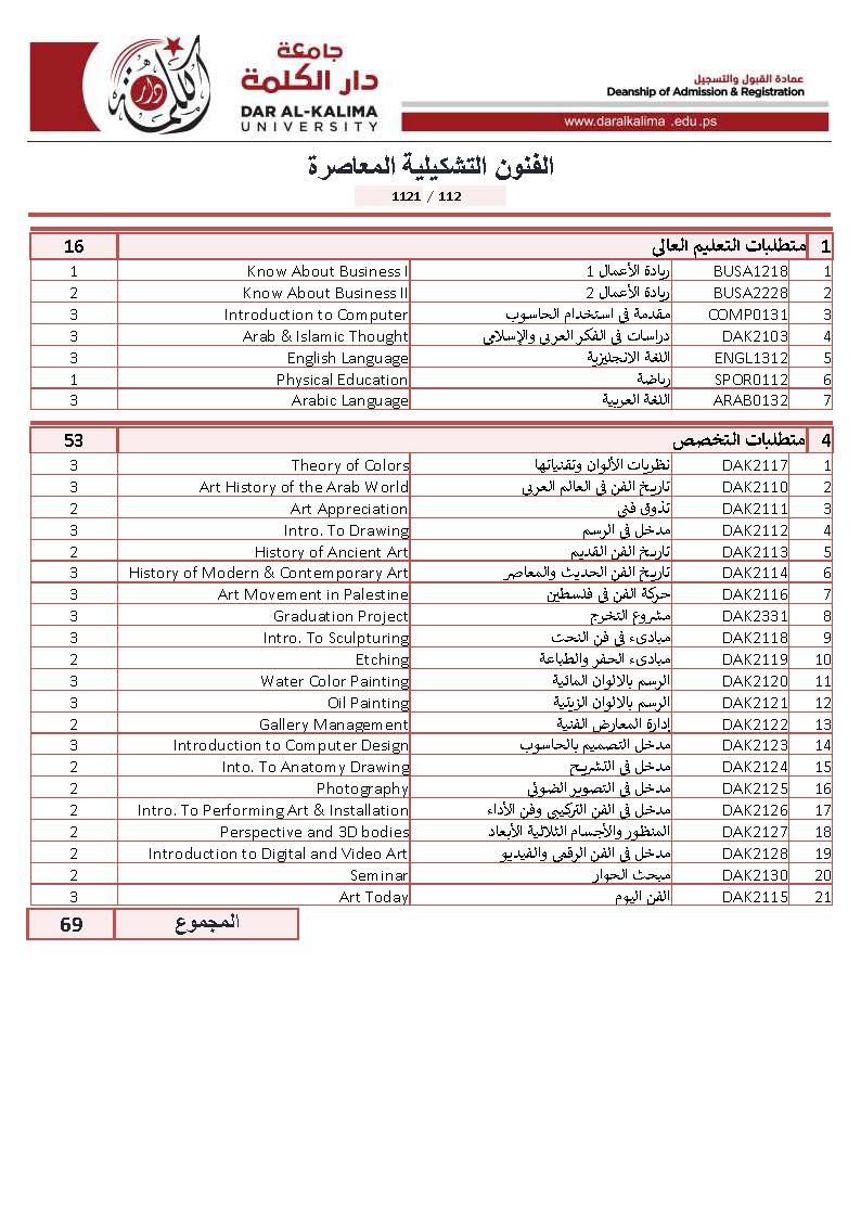 نبذة عن البرنامج: يشمل دراسة أساسيات وتقنيات الفن من رسم وتصوير لوني ونحت وتصوير فوتوغرافي وغيرها. ويدرس الطالب تاريخ الفن وأسس التربية الفنية، لتمكين الطالب من العمل في مجال الإنتاج الفني و/أو تعليم الفنون.
