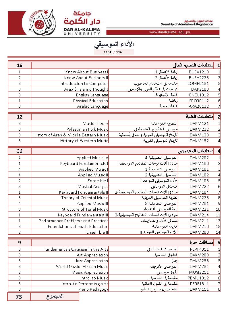 نبذة عن البرنامج: يشمل دراسة العلوم الموسيقية الأساسية، منها الأداء والدراسات التاريخية والنظرية، بالإضافة إلى التربية الموسيقية من خلال التطبيق العملي والمهاراتي الإبداعي.
