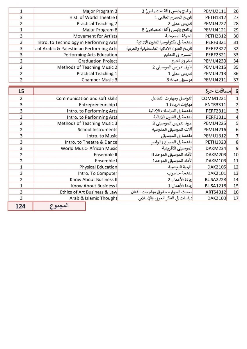 نبذة عن البرنامج: يعد هذا البرنامج الأكثر حداثة في فلسطين في مجال الفنون الأدائية الموسيقية، حيث يتناول في ثناياه قواعد وأسس الموسيقى كأحد أهم أشكال الفنون الأدائية، وذلك بشكل متكامل. يشمل البرنامج دراسة العلوم الموسيقية الأساسية، وكذلك الأداء العملي على الآلات الموسيقية المختلفة، بالإضافة إلى الدراسات التاريخية والتربوية والنظرية الموسيقية، وذلك من خلال التطبيق العملي والمهاراتي الإبداعي، ما يؤهل الطالب الملتحق بهذا البرنامج أن يكون عازفاً أو مغنياً، أو مؤلفاً موسيقياً محترفاً، وذلك من خلال تنمية وتطوير موهبته أكاديميا، حيث يفتح البرنامج للطالب الموهوب الملتحق به آفاقاً جديدة يحقق من خلالها أحلامه بأن يصبح موسيقياً مشهوراً. كذلك يؤهل البرنامج الطالب بأن يكون أيضاً معلماً متخصصاً في تدريس الموسيقى سواء بالمدارس ورياض الأطفال أو بالمعاهد والمراكز الثقافية، ما يفتح للطالب آفاقاً جديدة في سوق العمل الفلسطيني، وذلك بسبب النقص الشديد في معلمي الموسيقى في المدراس الفلسطينية.