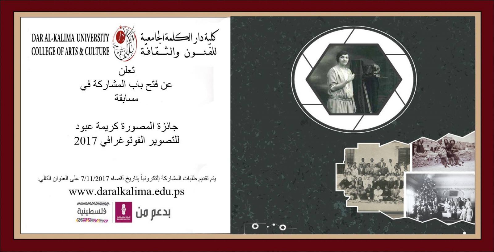 بإمكانكم الاطلاع على إعلان فتح باب المشاركة في مسابقة جائزة كريمة عبود للتصوير الفوتوغرافي من خلال النقر على الصورة