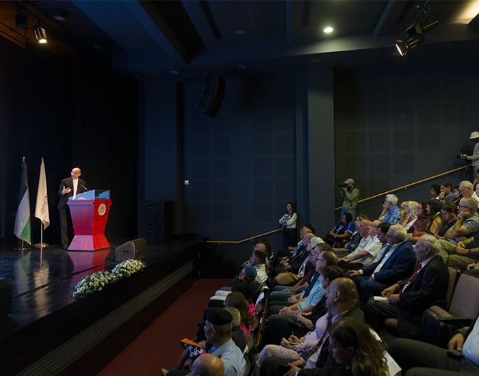 Then, Mrs. Manar Idrissi, Dean of Student Affairs and Curator of the Ismail Shammout Award for Fine Arts, gave a speech in which she emphasized: “The Ismail Shammout Award for Fine Arts was established in Palestine in 2015 to honor the legacy of Ismail Shammout, encourage young Palestinian artists, and highlight the role of art in society. Ismail Shammout, a prominent Palestinian artist, used his creativity to express the impact of the Nakba and to be a source of hope in the face of oppression. The award is launched annually by Dar al-Kalima University and comes under the title “Barrier 75” for the year 2023, in celebration of the 75th anniversary of the Nakba. It aims to continue Shammout’s vision by confronting the barriers imposed by settler colonialism and promoting freedom, hope, and artistic awareness in Palestinian society.”