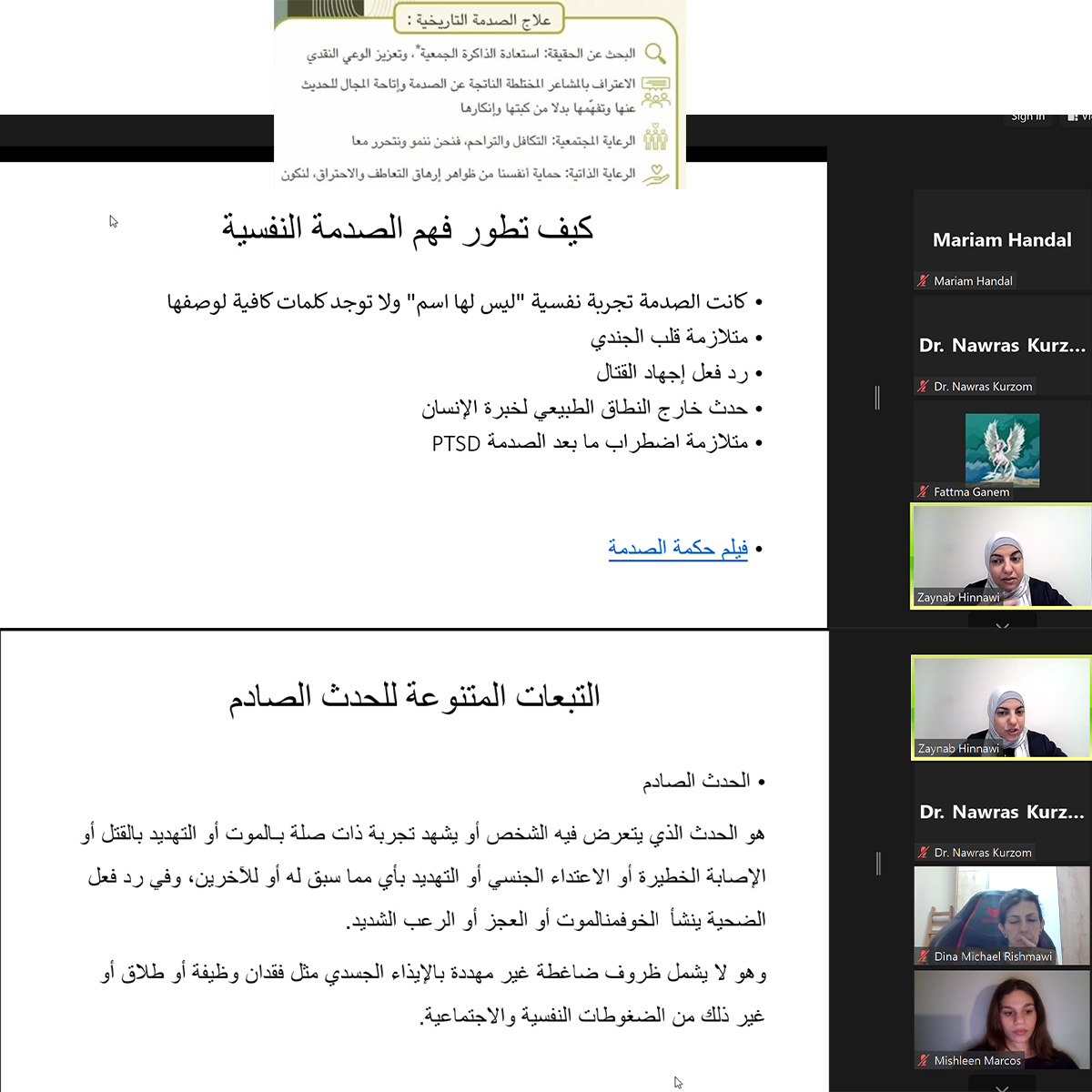 As part of the Healing War Trauma project at Dar Al-Kalima University, and coordinated by Dr. Nawras Kurzom, clinical psychologist Zainab Al Hinnawi conducted a specialized workshop on the concept of psychological trauma in the context of war, with a focus on the Palestinian context, from May 14-19, 2024. The workshop was attended by Master's students in Art Therapy at Dar Al-Kalima University, as part of their preparatory activities to equip them with the skills they will use in fieldwork.