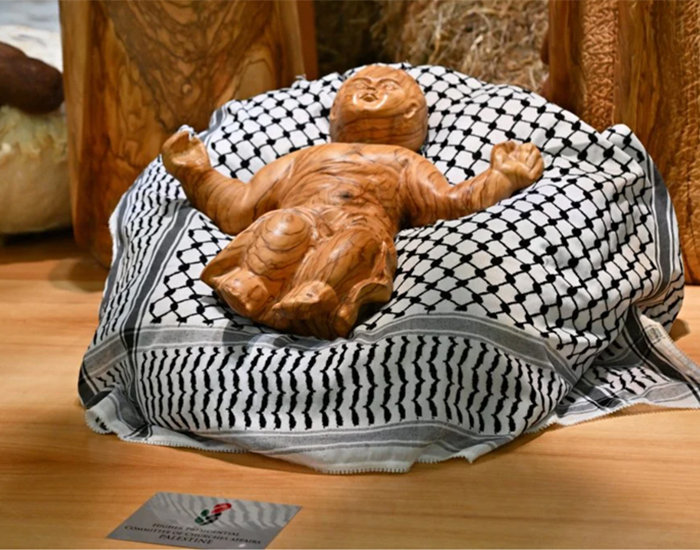 On Saturday, Pope Francis unveiled a nativity scene in the Vatican’s Paul VI Hall that was created by Palestinian artists from Dar al-Kalima University in Bethlehem. The baby Jesus’s cradle is draped in a traditional Palestinian Keffiyeh, with other elements produced by local craftspeople according to age-old traditions.
