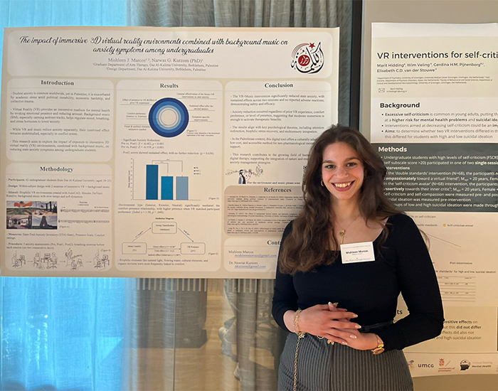 Student Mishleen Marcos, from the Master’s Program in Art Therapy at Dar al‑Kalima University, participated in the 2nd International Conference on Virtual Reality and Mental Health held in Helsingborg, Sweden. A distinguished group of specialists in psychology and virtual reality from universities around the world took part in the conference.