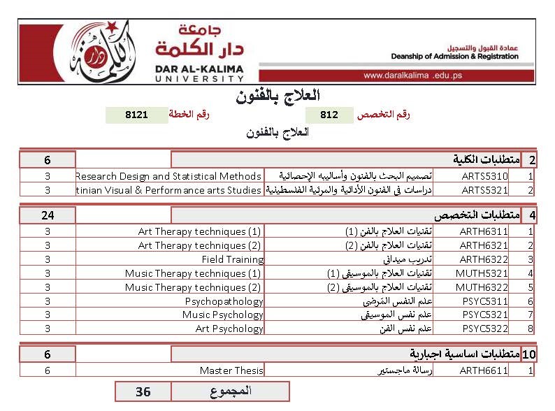 Fields of work:This program paves the way for graduates to access a multitude of job prospects across diverse mental health sectors, spanning healthcare, various social sciences, and education across all levels. Graduates are equipped to function within art psychotherapy roles in hospitals and psychiatric clinics. Moreover, opportunities extend to engagement in psychological counseling and psychosocial health services in healthcare facilities, clinics, schools, psychiatric institutions, as well as rehabilitation and recovery centers. In doing so, this program effectively addresses the existing gap in the availability of Palestinian professionals within this specialized field.